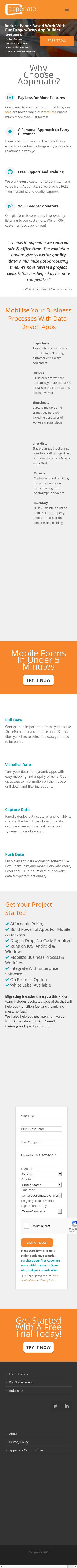 | Description | The use of our Paper-to-Mobile ROI Calculator calculates the savings of moving from paper-based activities to mobile forms | Transform Business Processes. Inspections, Checklists, Timesheets and more. No programming required. Get Started With A Free Trial | N/A |