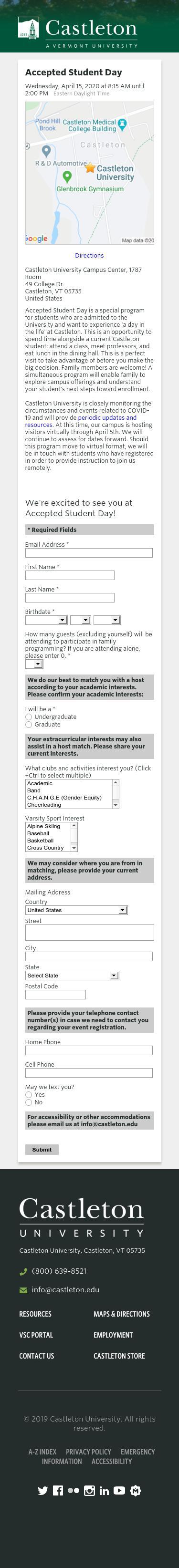 - Visit options at Castleton University include individualized visit & open house dates, meetings with faculty, athletics, and financial aid.