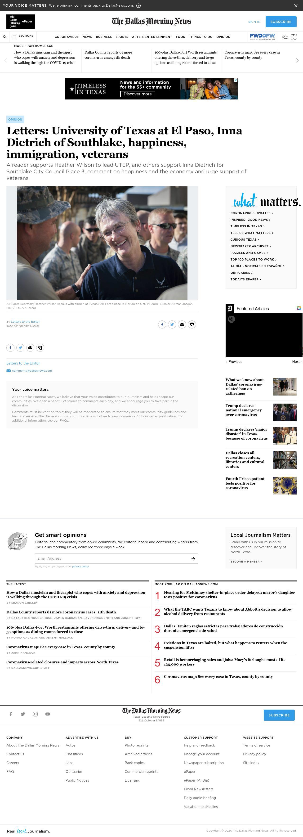 Title:Letters: University of Texas at El Paso, Inna Dietrich of Southlake, happiness, immigration, veterans
