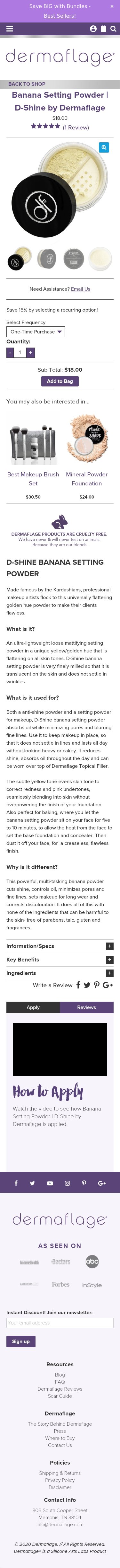 Description:D-SHINE BANANA SETTING POWDER. Made famous by the Kardashians, professional makeup artists flock to this universally flattering golden hue powder to make their clients flawless. What is it? An ultra-lightweight loose mattifying setting powder in a unique