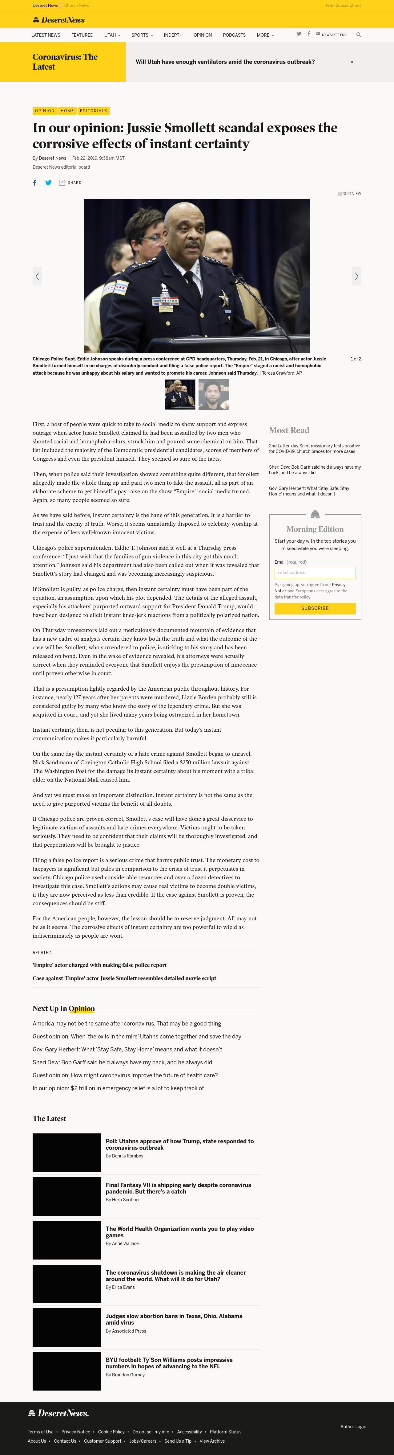 Title:Deseret NewsIn our opinion: Jussie Smollett scandal exposes the corrosive effects of instant certainty - Deseret News