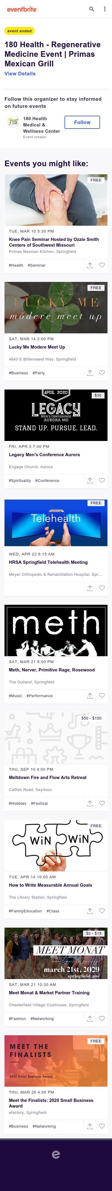 Description:Eventbrite - 180 Health Medical & Wellness Center presents 180 Health - Regenerative Medicine Event | Primas Mexican Grill - Tuesday, February 25, 2020 at Primas Mexican Grill, Springfield, MO. Find event and ticket information.