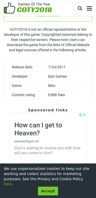 Description:All about š® Fortnite at GOTY2018. āļø Price comparison for Playstation 4 āļø Reviews and Rating āļø Guides
