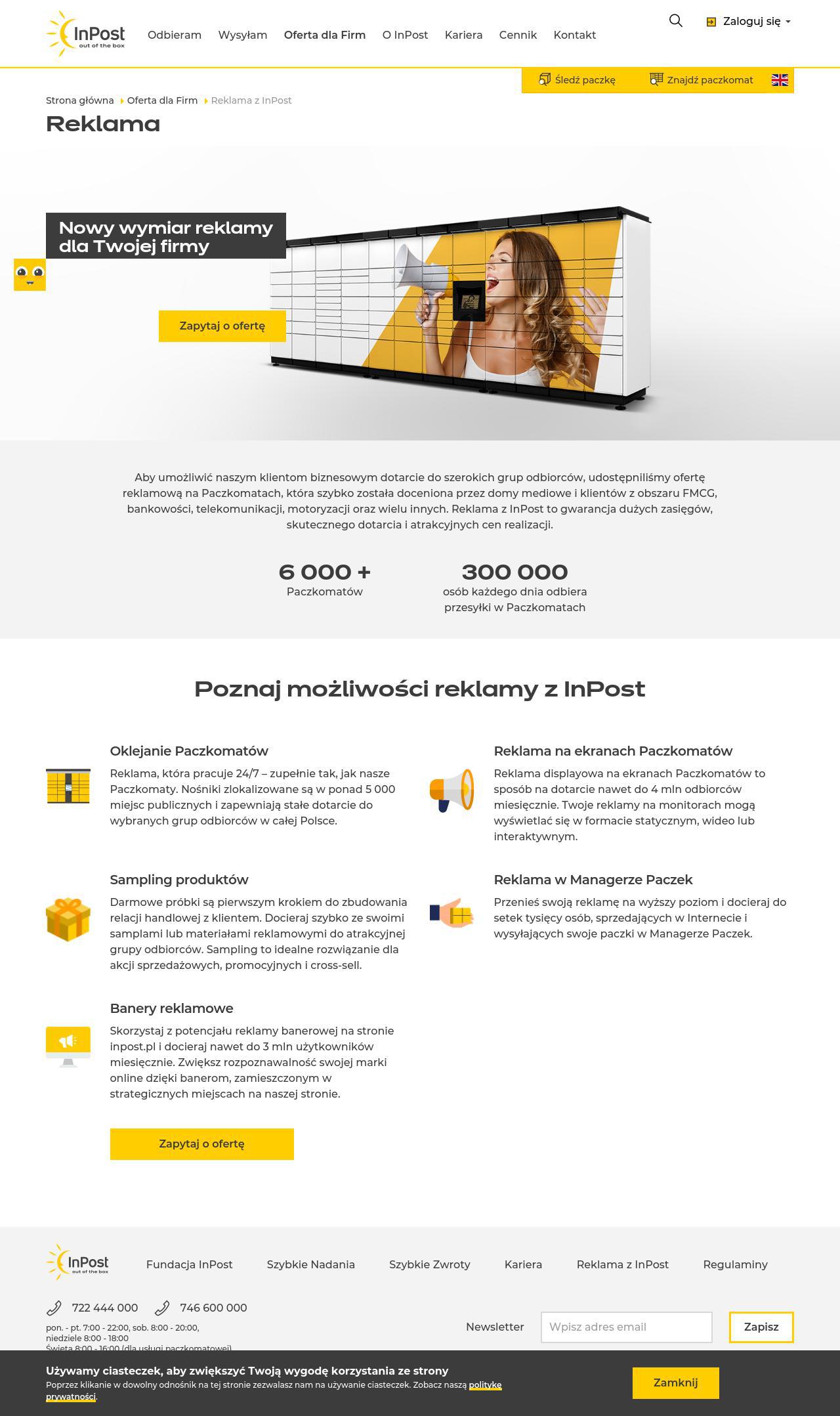 Description:Reklama z InPost to niestandardowe formy reklamy dla firm, domów mediowych i agencji marketingowych. Reklama na ekranach i oklejanie Paczkomatów, sampling produktów, direct mailing i mailingi komercyjne. Poznaj ofertę reklamową InPost »