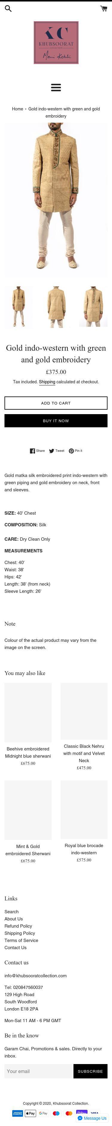 Description:Gold matka silk embroidered print indo-western with green piping and gold embroidery on neck, front and sleeves. SIZE: 40' Chest COMPOSITION: SilkCARE: Dry Clean Only MEASUREMENTS Chest: 40'Waist: 38'Hips: 42'Length: 38' (from neck)Sleeve Length: 26