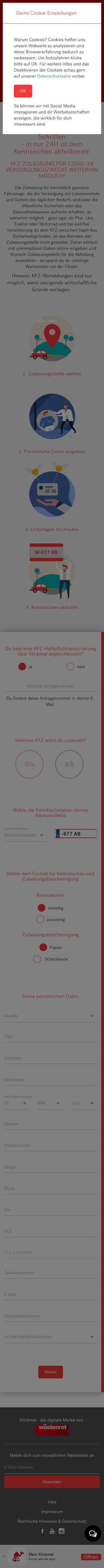 Description:Bei Klickmal kannst Du Dein Fahrzeug in 4 einfachen Schritten online zur Zulassung bringen