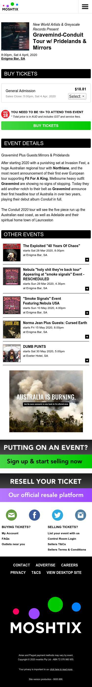 Description: Moshtix is an industry leading GA ticketing provider specialising in live music and entertainment events. Buy and sell your event tickets with Moshtix Buy Gravemind-Conduit Tour w/ Pridelands & Mirrors tickets for 2020 at Moshtix. T