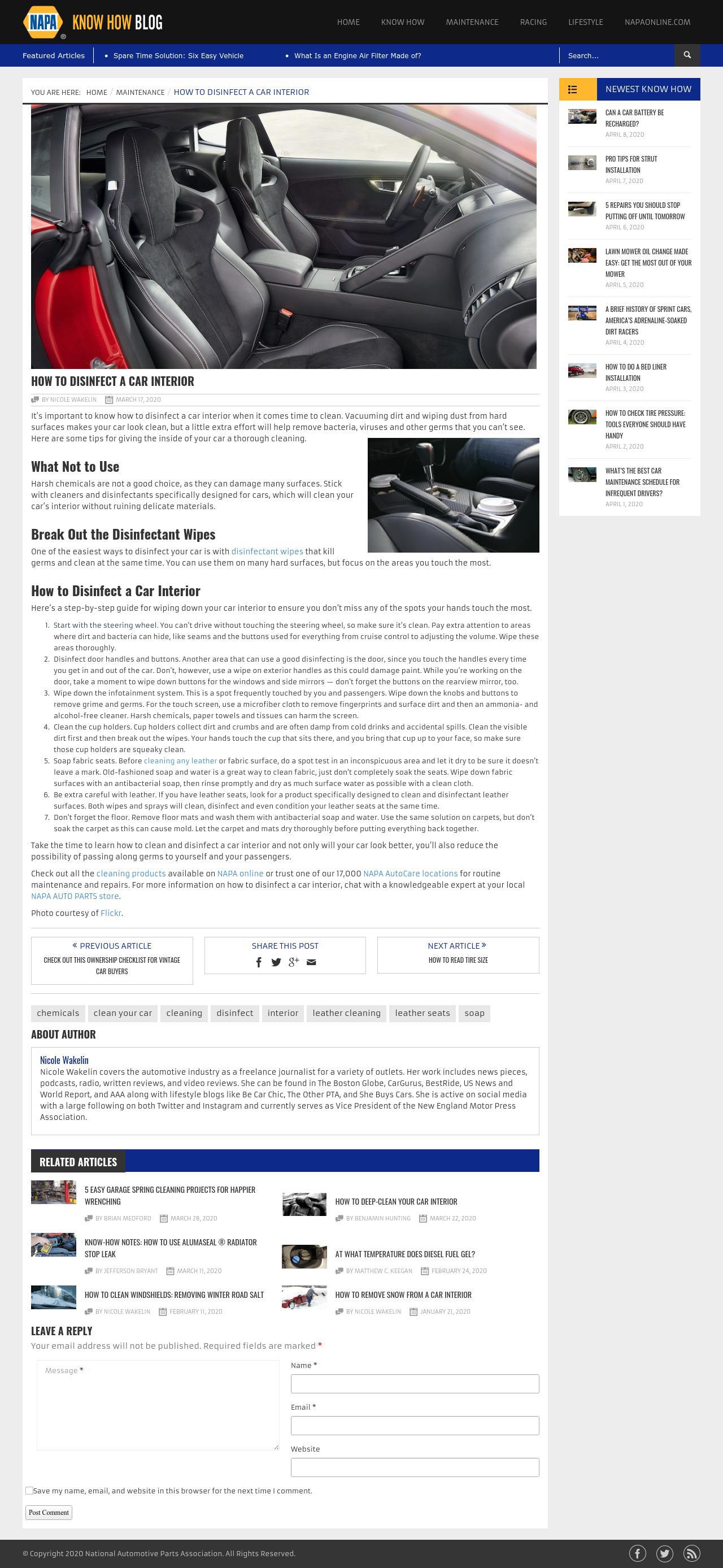 - It's important to know how to disinfect a car interior, especially during cold and flu season. Use these steps to get your car interior clean and germ-free
