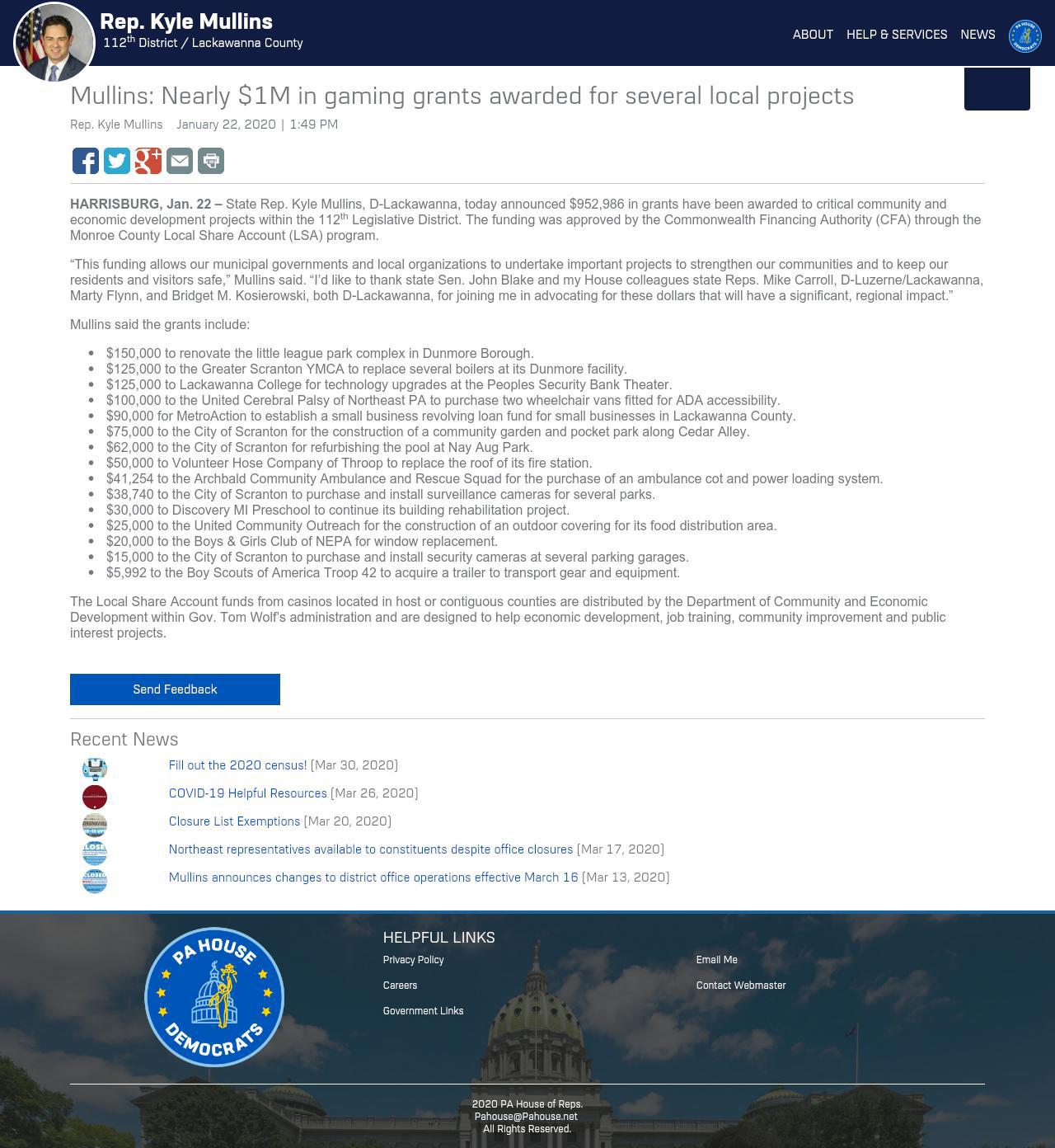 - HARRISBURG, Jan. 22 – State Rep. Kyle Mullins, D-Lackawanna, today announced $952,986 in grants have been awarded to critical community and economic development projects within the 112th Legislative District. The funding was approved by the Commonwealth F