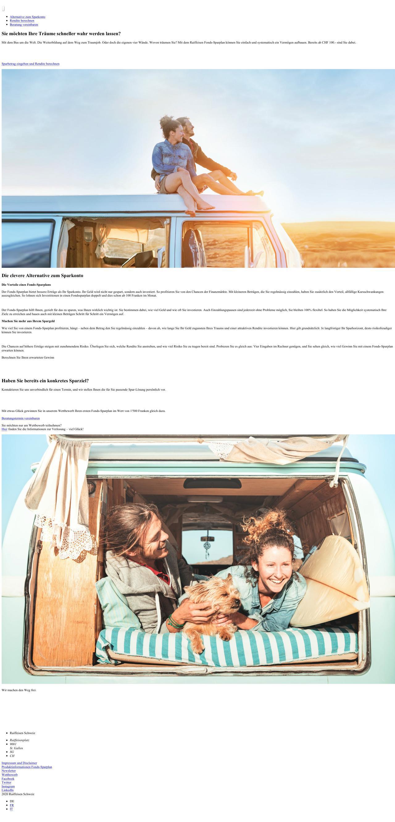 Description:Mit dem Bus um die Welt. Die Weiterbildung auf dem Weg zum Traumjob. Oder doch die eigenen vier Wände. Wovon träumen Sie? Mit dem Raiffeisen Fonds-Sparplan können Sie einfach und systematisch ein Vermögen aufbauen.