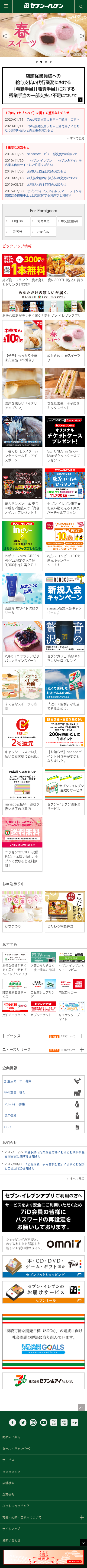 Description:セブンイレブンの公式ウェブサイト。電子マネーnanaco、新商品紹介、キャンペーン情報、セブン-イレブンネット、コンビニATM、各種店舗でのサービスなどのご紹介。企業情報掲載。